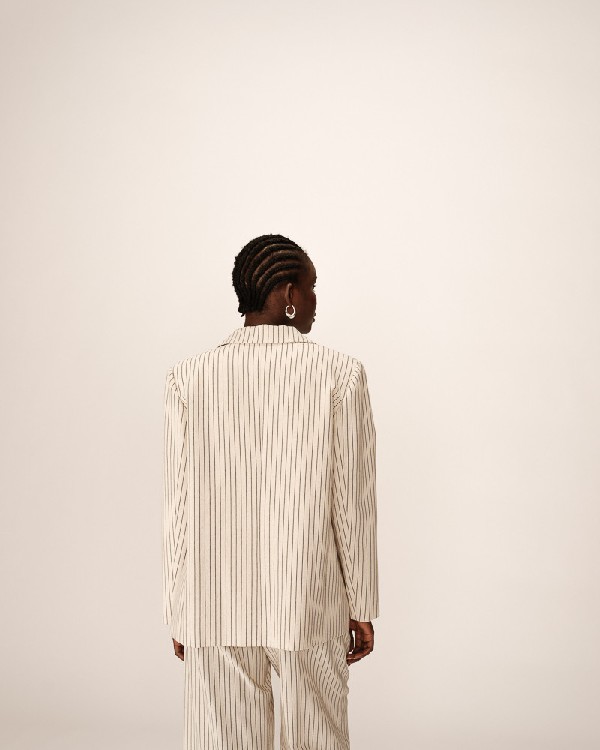 La veste de costume PIA est une pièce emblématique de la collection. Le modèle a des manches longues, un col à revers ainsi qu'une encolure en V qui dessinent une silhouette sophistiquée. La veste tailleur PIA a une coupe décontractée et un tissu à rayures qui allie élégance et modernité. Doublée et confectionnée dans un tissu en fibres naturelles et rejoint notre gamme 'Un Brin de Vert'.