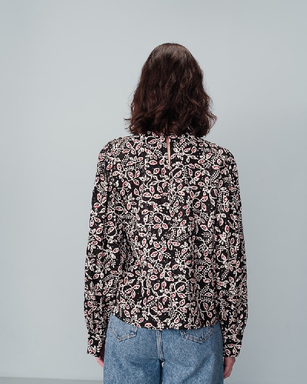 La blouse à encolure ronde NIMES est confectionnée dans un tissu en rayonne et en viscose et dans un imprimé exclusif Grace & Mila. L'imprimé floral du modèle signe une inspiration bohème et dessine une silhouette élégante et féminine. La blouse a une ouverture boutonnée dans le dos et des fronces aux manches qui soulignent la féminité de cette pièce.