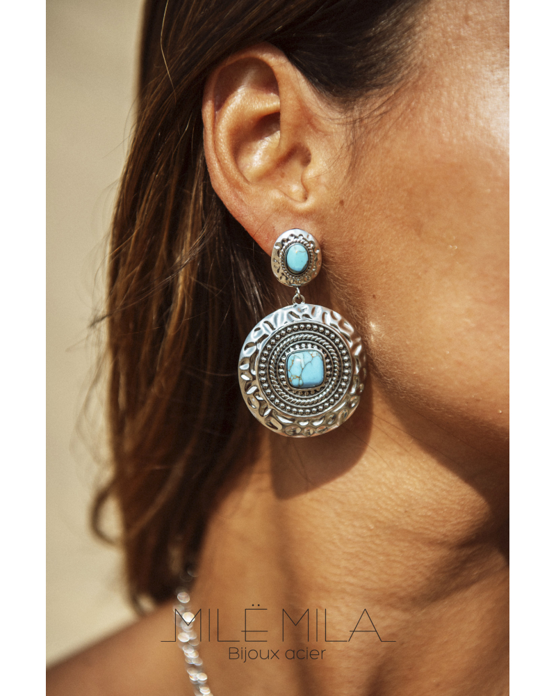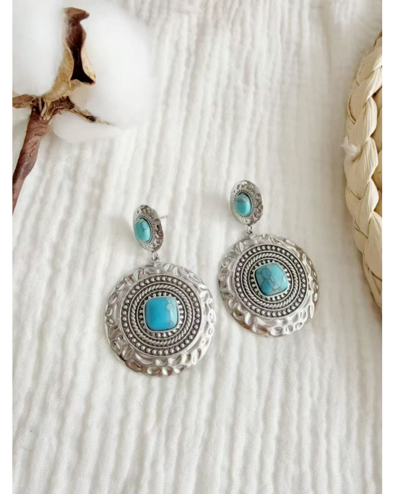 / boucle d’oreille bohème chic turquoise ronde argent vieilli