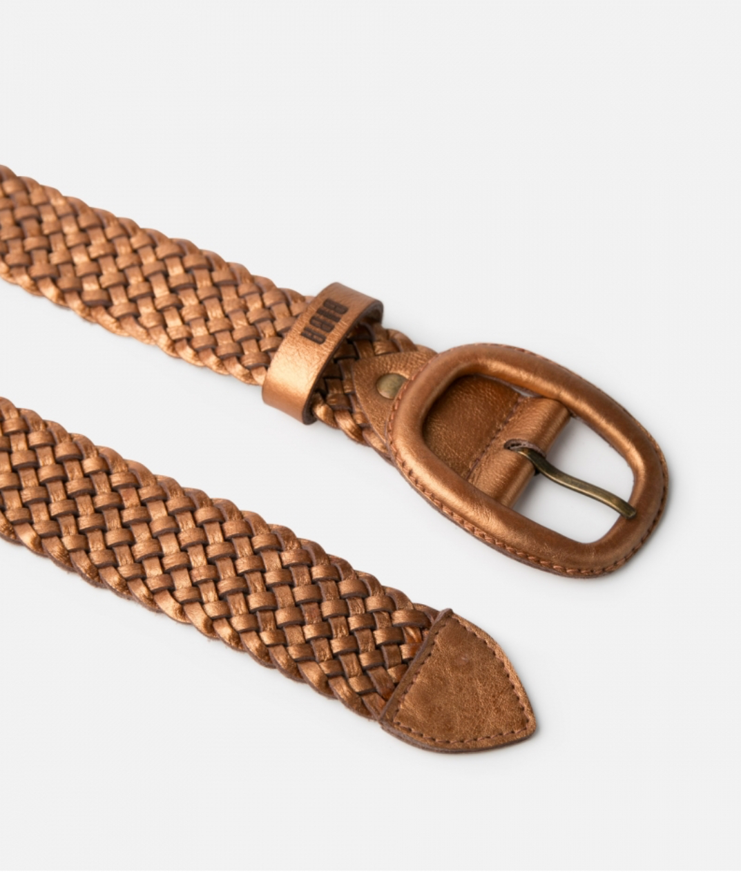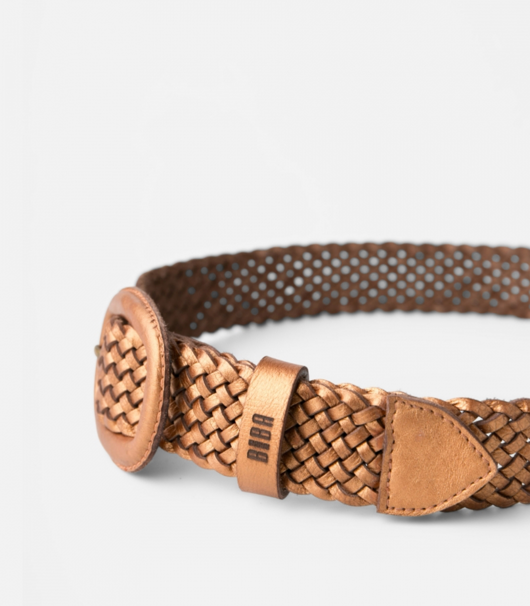 Ceinture en cuir de vachette lavée, tressée et irisée. Largeur de 4 cm. Vis à l’arrière pour un ajustement manuel. Boucle doublée en cuir.