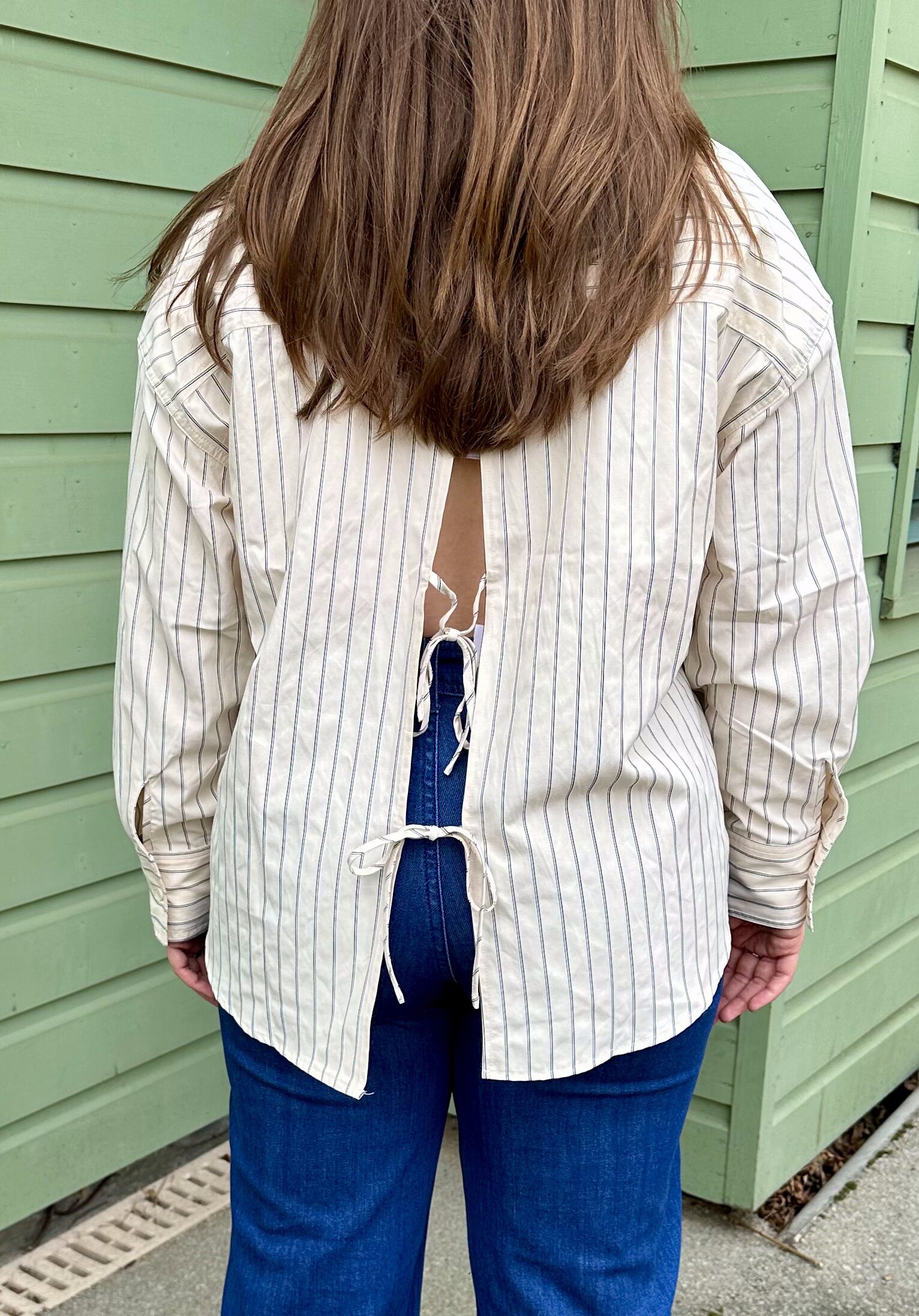 Le col chemise et la patte de boutonnage structurent la silhouette, tandis que la poche poitrine brodée “grace” apporte une signature délicate. Son détail coup de cœur : une ouverture au dos avec lien à nouer, qui dévoile subtilement la silhouette et ajoute une touche féminine inattendue.