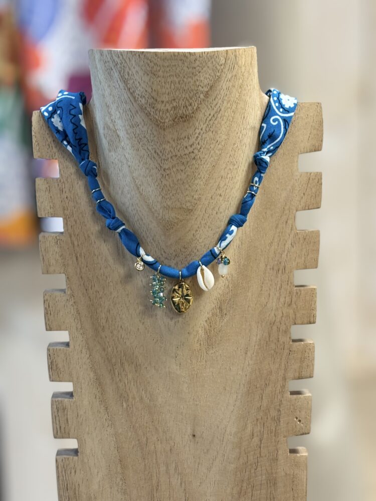 Apporter une touche bohème et élégante à votre tenue avec ce collier de la marque Badhnati. Confectionné à la main dans un tissue coloré au motif bandana, il se noue facilement grâce a son lien ajustable. Polyvalent, il se porte aussi bien en collier, en bracelet ou en chevillière. Adoptez cette pièce pour un look à la fois décontracté et raffiné.