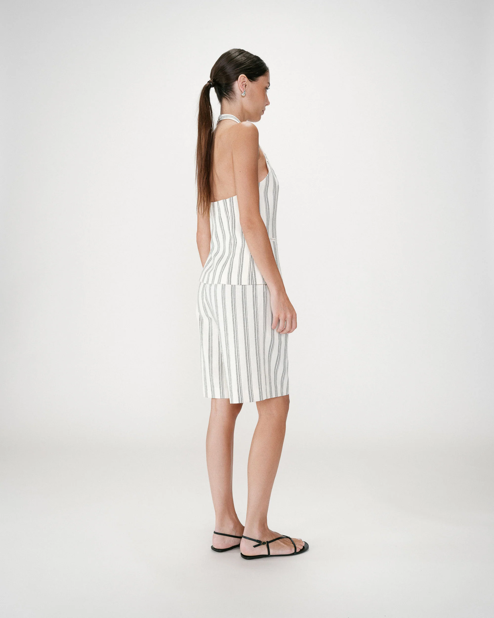 Détails produit : gilet de tailleur à rayures, coupe ajustée, décolleté en V, fermeture boutonnée au dos et sur le devant, dos nu, poches passepoilées à l’avant, entièrement doublé.