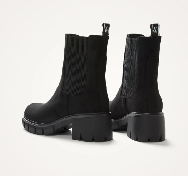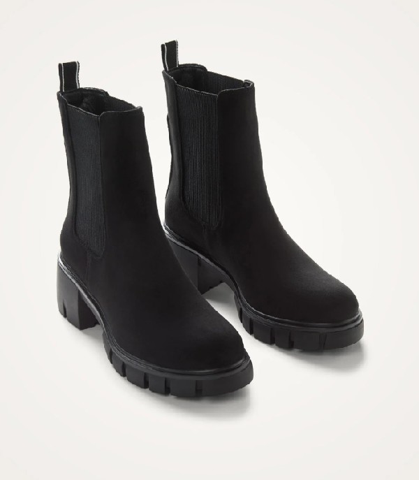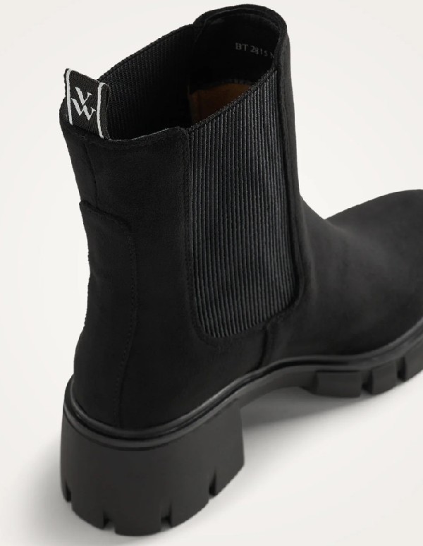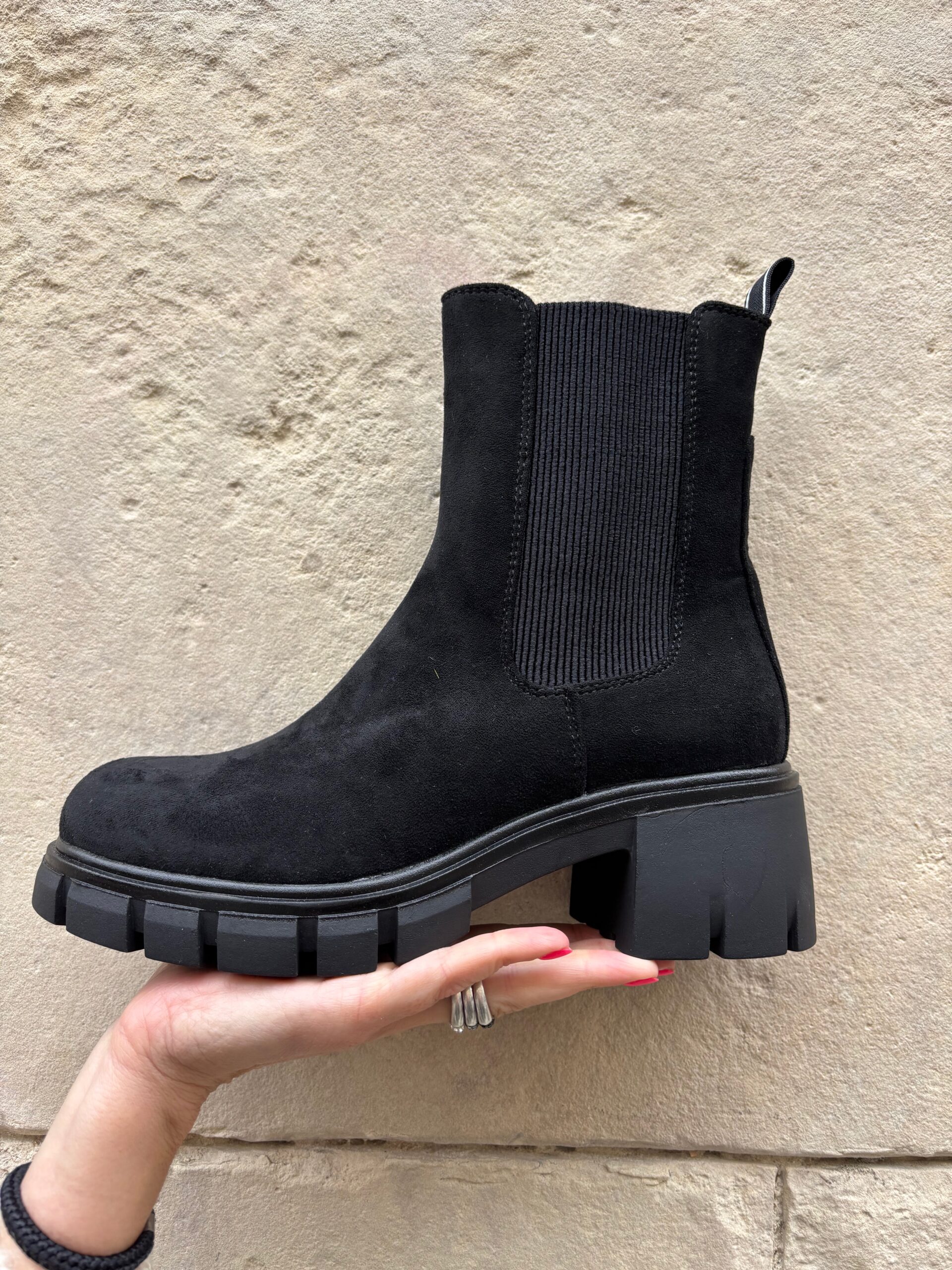 – Bottines Chelsea montantes en suédine noire- Fermeture à élastiques noirs- Bout rond- Talon et semelle épaisse crantée noirs