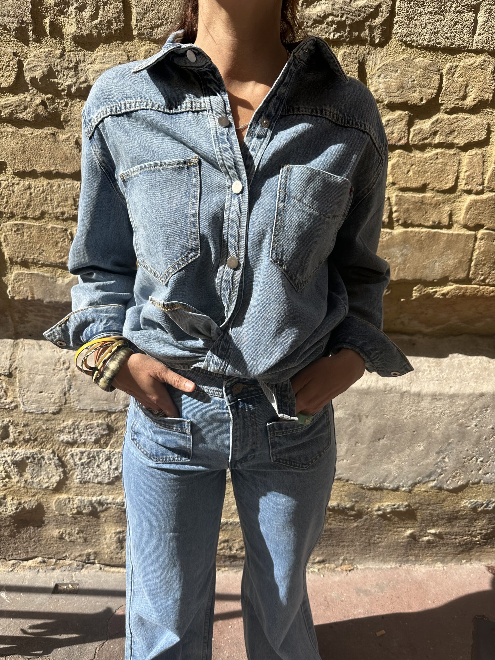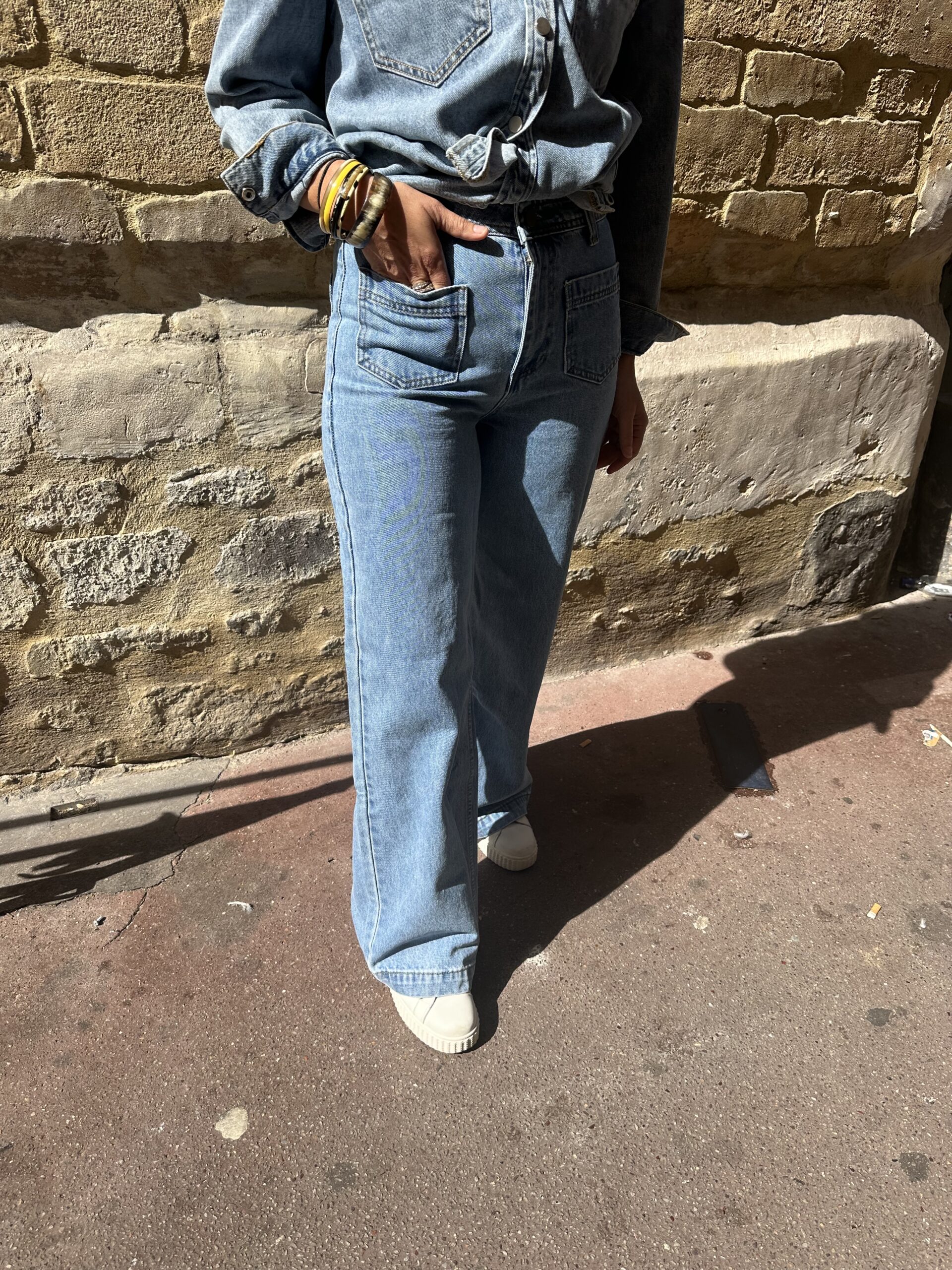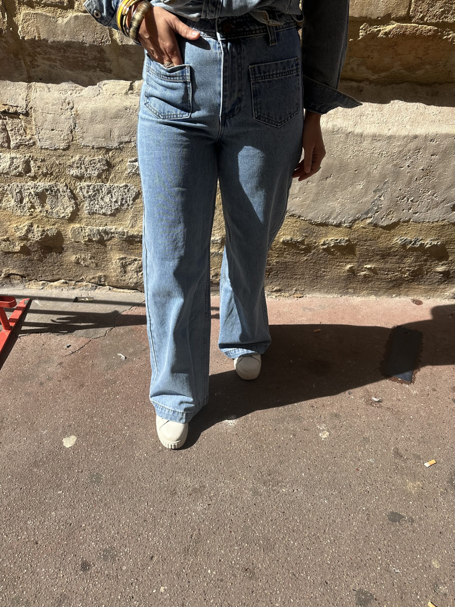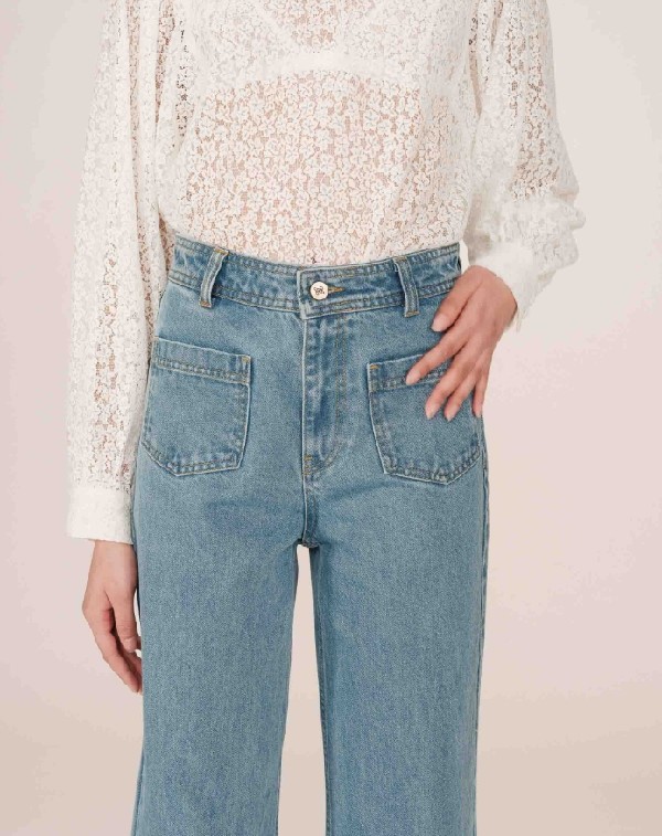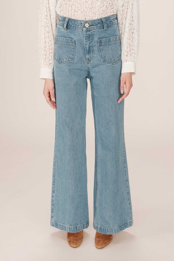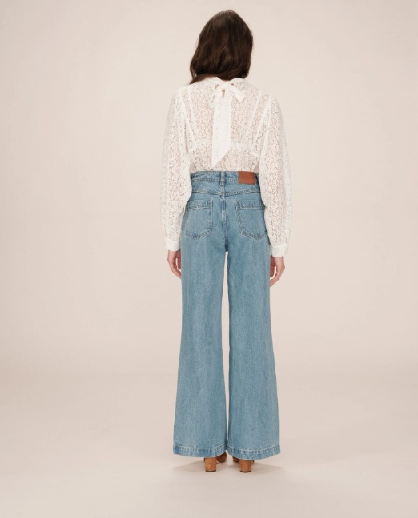 La taille haute et la coupe flare du jean JACOB dessinent une silhouette élancée et élégante. Le modèle présente des passants à la taille, une fermeture zippée et un bouton monogrammé G&M à la taille. Le jean évasé JACOB est agrémenté d'un jacron en cuir au dos.