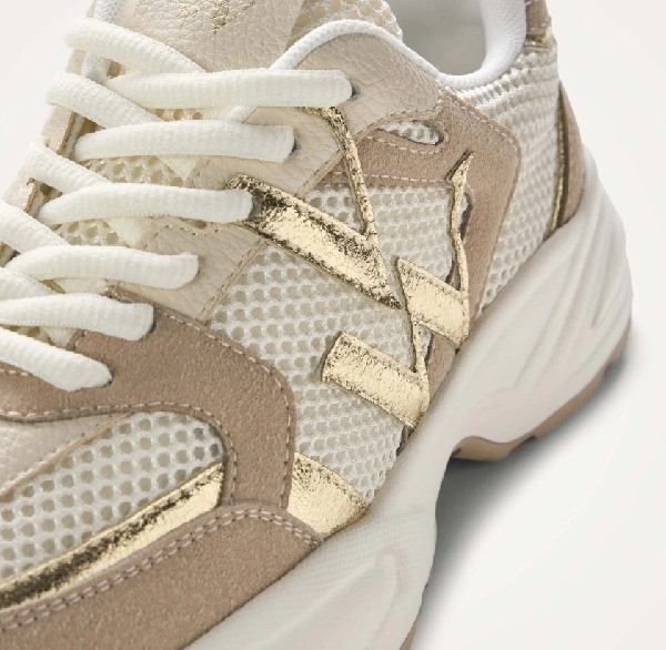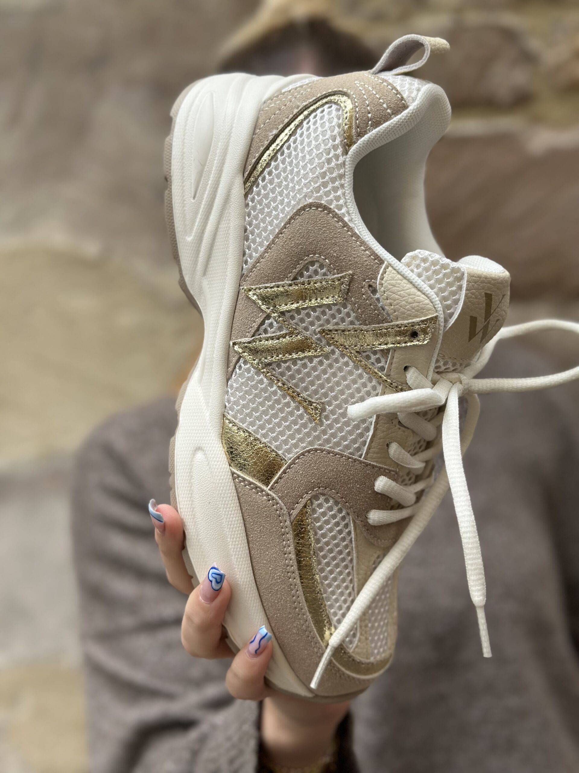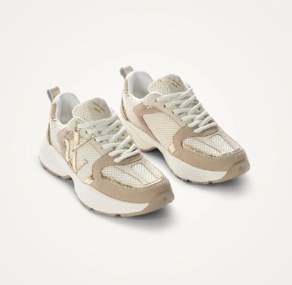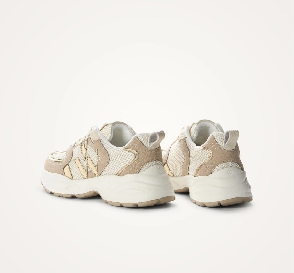 – Baskets style running en mesh blanc- Monogramme en similicuir texturé or- Empiècements en suédine effet daim fendu beige- Contrefort et bout avant en suédine effet daim fendu beige- Liserés en similicuir texturé or- Garants en similicuir beige clair effet grainé débordant sur l'empeigne- Fermeture à lacets blancs- Bout rond- Semelle intérieure amovible à microbilles effet massant- Semelle rétro running- Dessous de semelle peint en beige