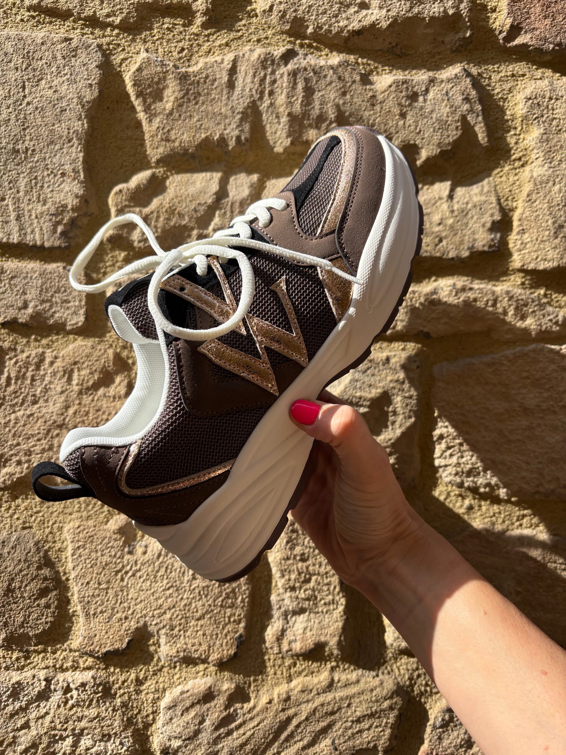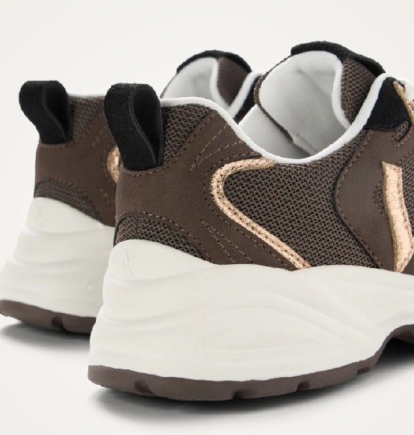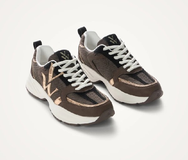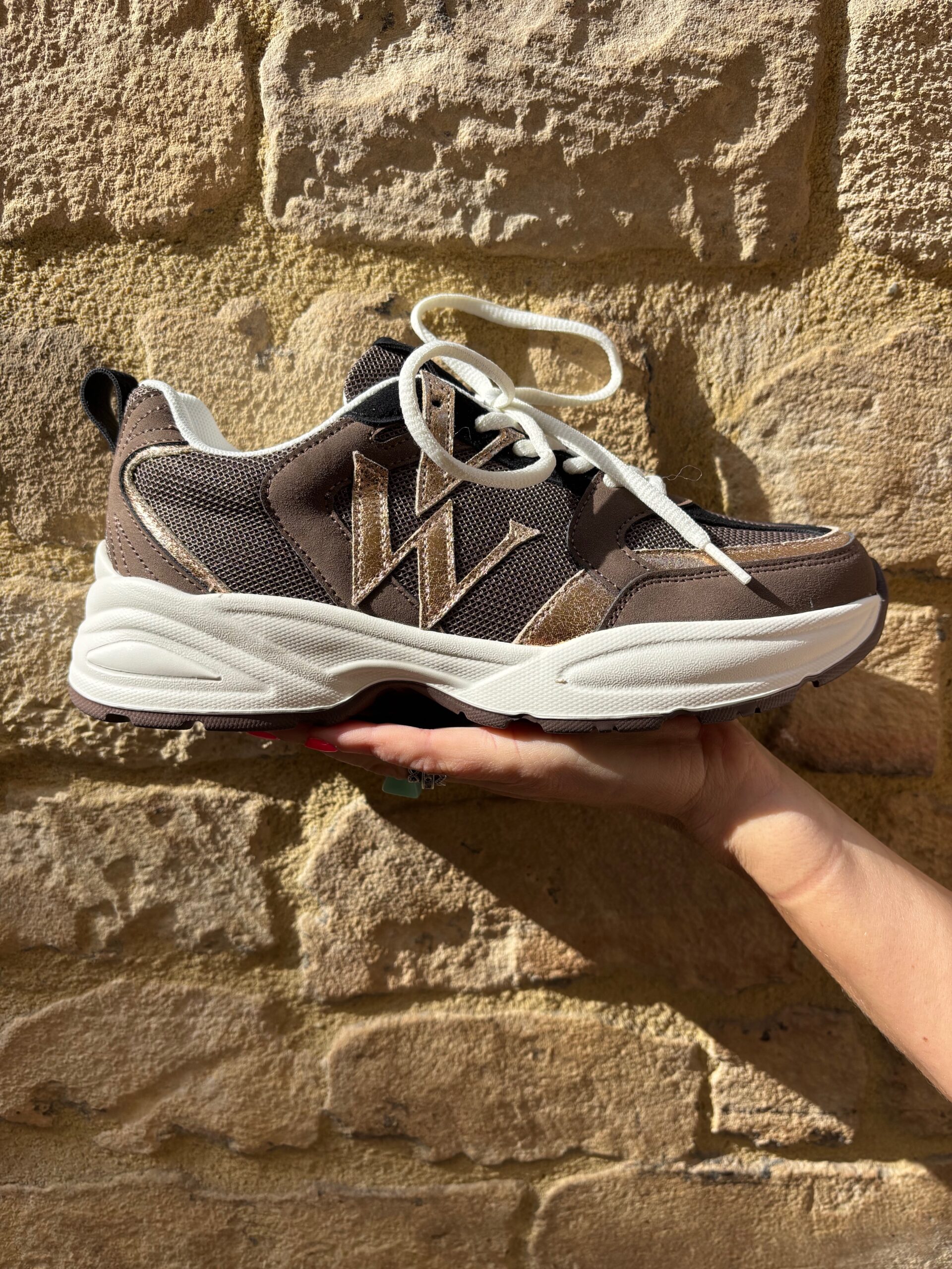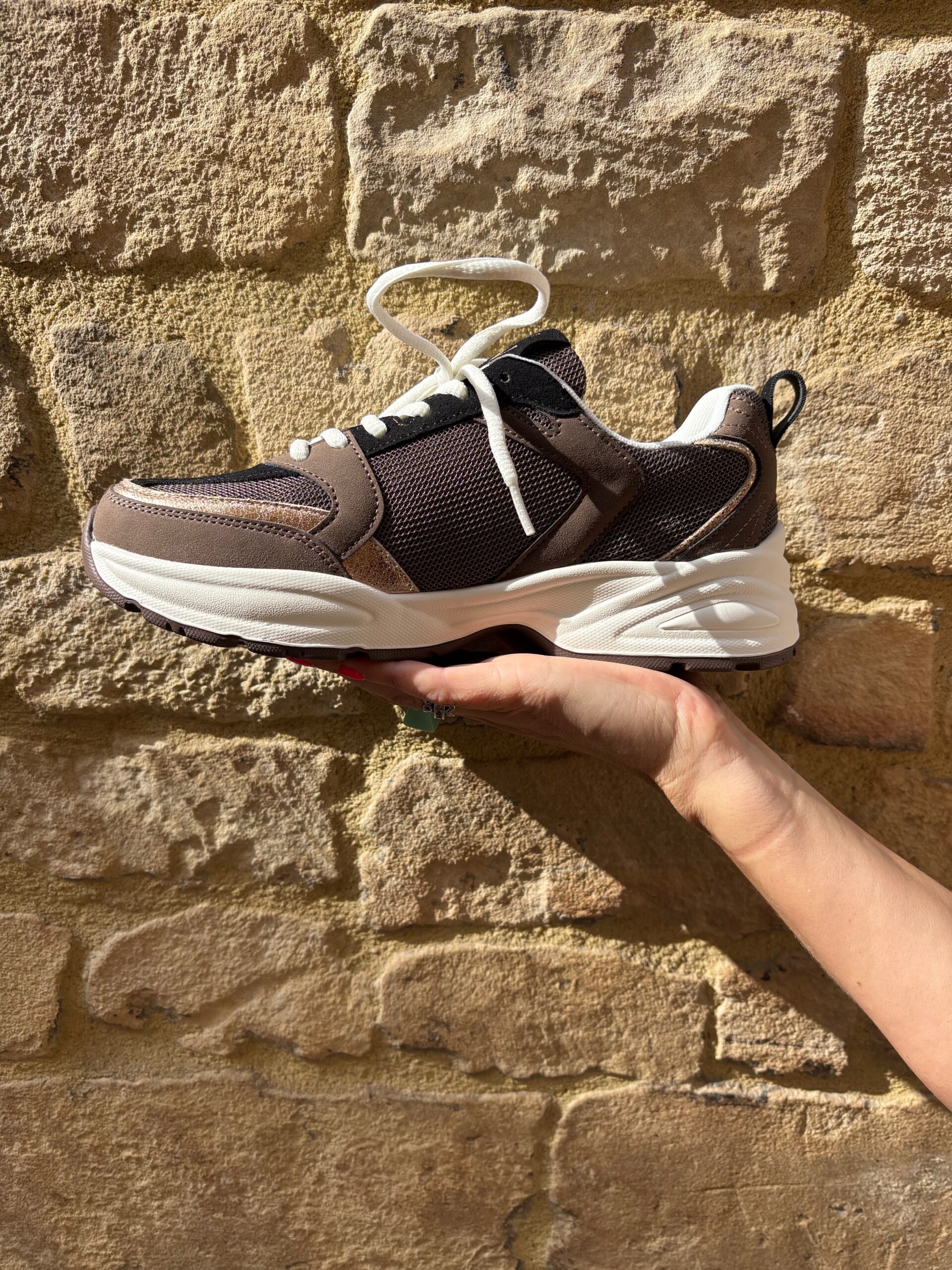 – Baskets style running en mesh marron foncé- Monogramme en similicuir texturé or- Empiècements en suédine effet peau de pêche marron foncé- Contrefort et bout avant en suédine effet peau de pêche marron foncé- Liserés en similicuir texturé or- Garants en suédine effet daim fendu noire débordant sur l'empeigne- Fermeture à lacets blancs- Bout rond- Semelle intérieure amovible à microbilles effet massant- Semelle rétro running- Dessous de semelle peint en marron foncé