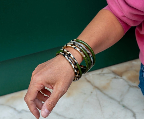 Bracelets en corne de buffle naturelle partiellement laquée de couleurs.