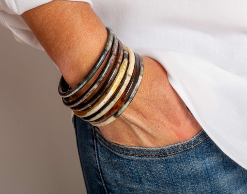 Bracelets en corne de buffle naturelle partiellement laquée de couleurs.