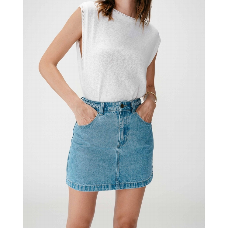 Jupe en denim taille haute, coupe droite avec détails tressés et broderie. Un essentiel revisité avec féminité.