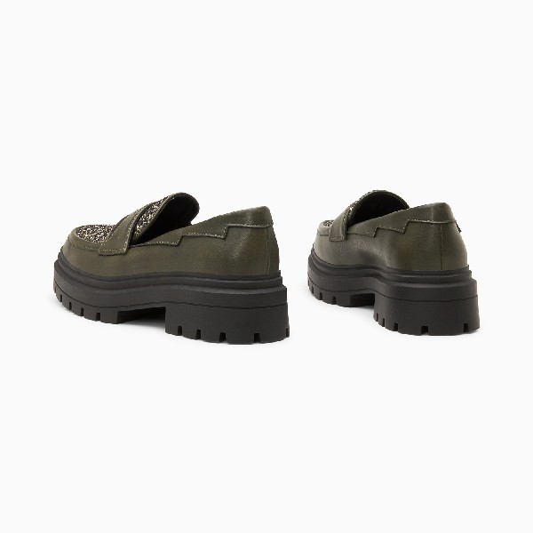– Mocassins en similicuir vert kaki- Empeigne à paillettes argent et noir- Applique en similicuir vert kaki avec découpe en forme d'éclair- Liseré ton sur ton en forme d'éclair- Bout rond- Semelle épaisse crantée noire