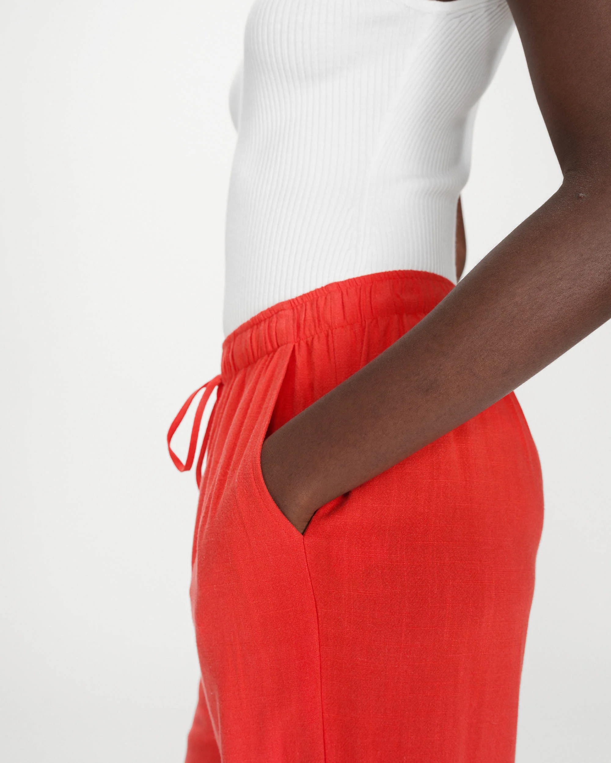 Détails produit : coupe droite, taille haute, ceinture élastiquée avec cordon de serrage, poches italiennes à l’avant.