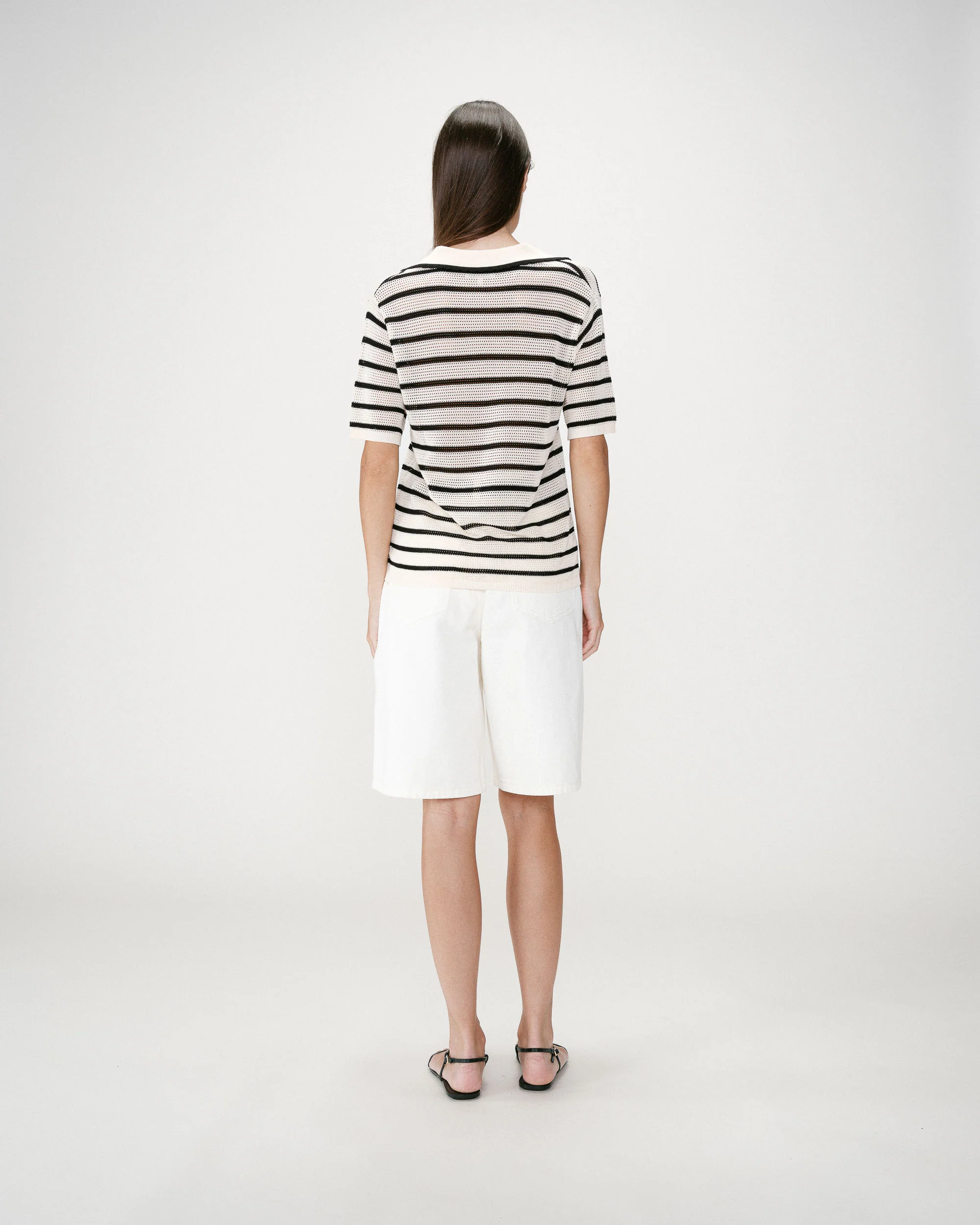 Détails produit : polo en maille ajourée 100 % lyocell, coupe droite, manches courtes, col polo avec encolure en V, finitions côtelées, bord festonné.