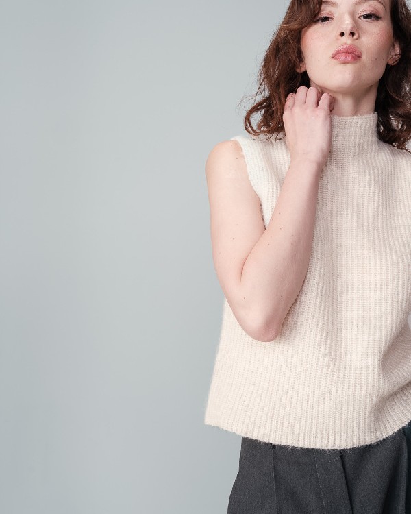 Confectionné dans un fil mélangé en laine d'alpaga, le top sans manches NAIMA est un indispensable du vestiaire automne/hiver. Moins moulant et tout aussi couvrant que le col roulé, l'encolure cheminée du top en maille NAIMA est idéal pour la mi-saison. Cette pièce est confectionnée dans un tissu certifié 100% écoresponsable, est un basique chaud et tendance de la collection.