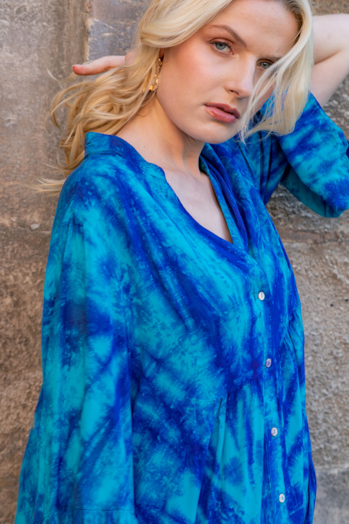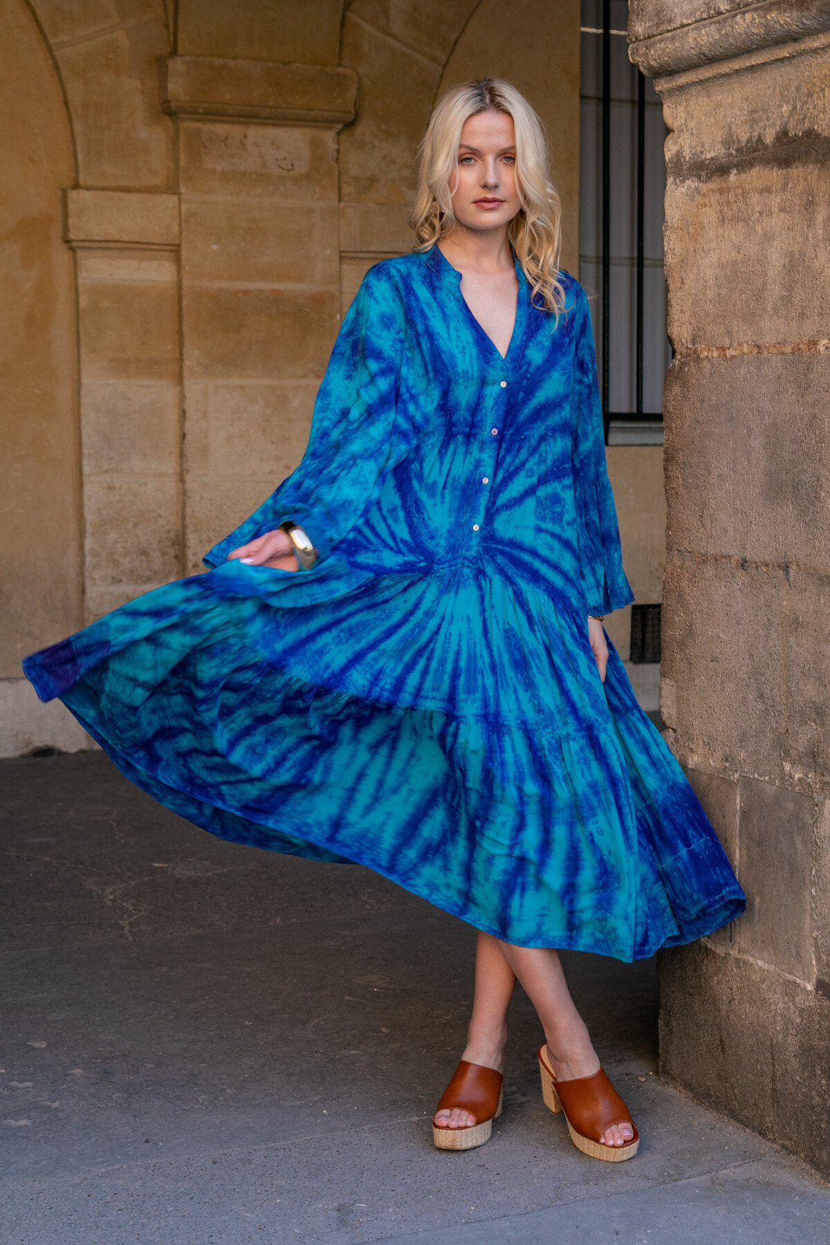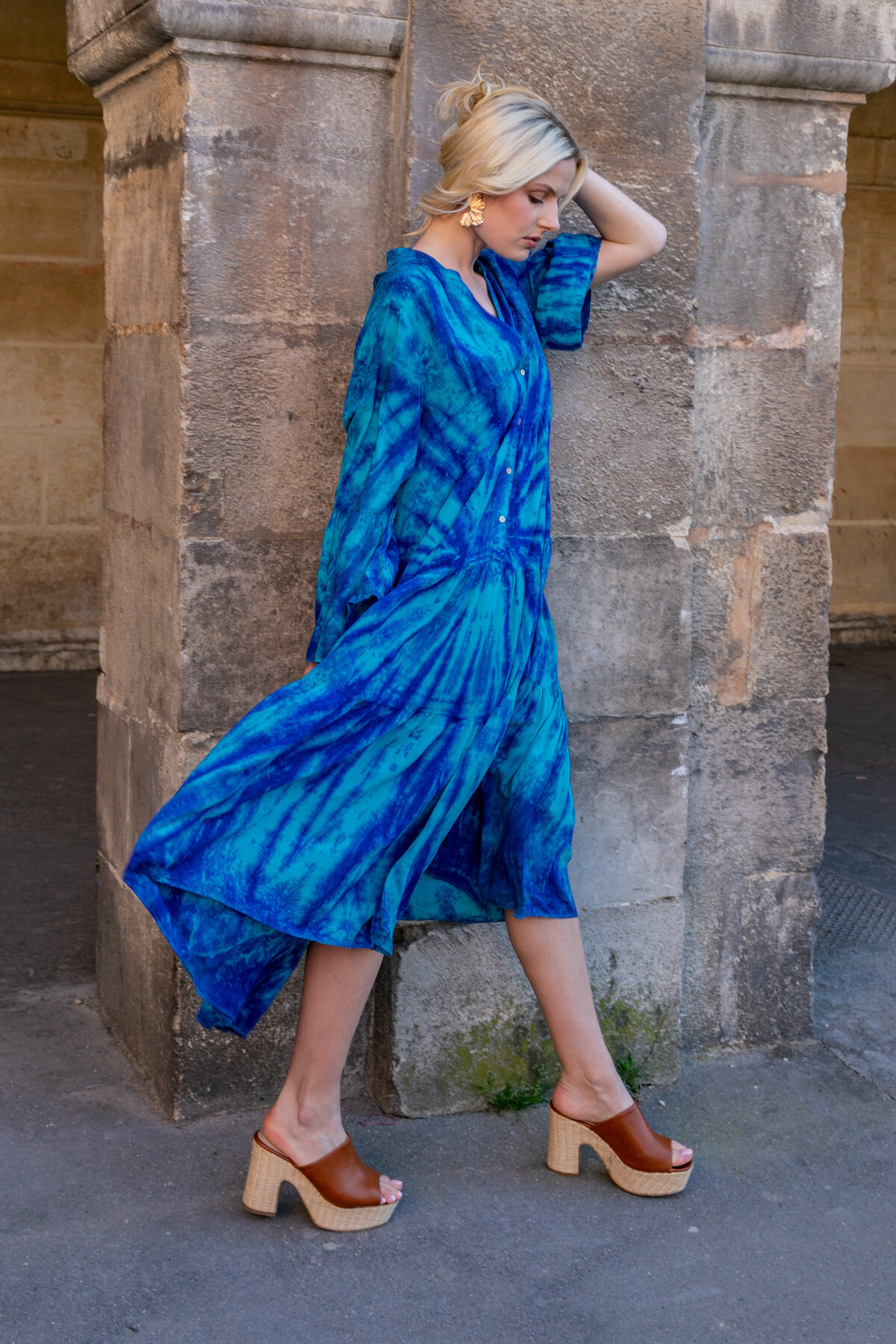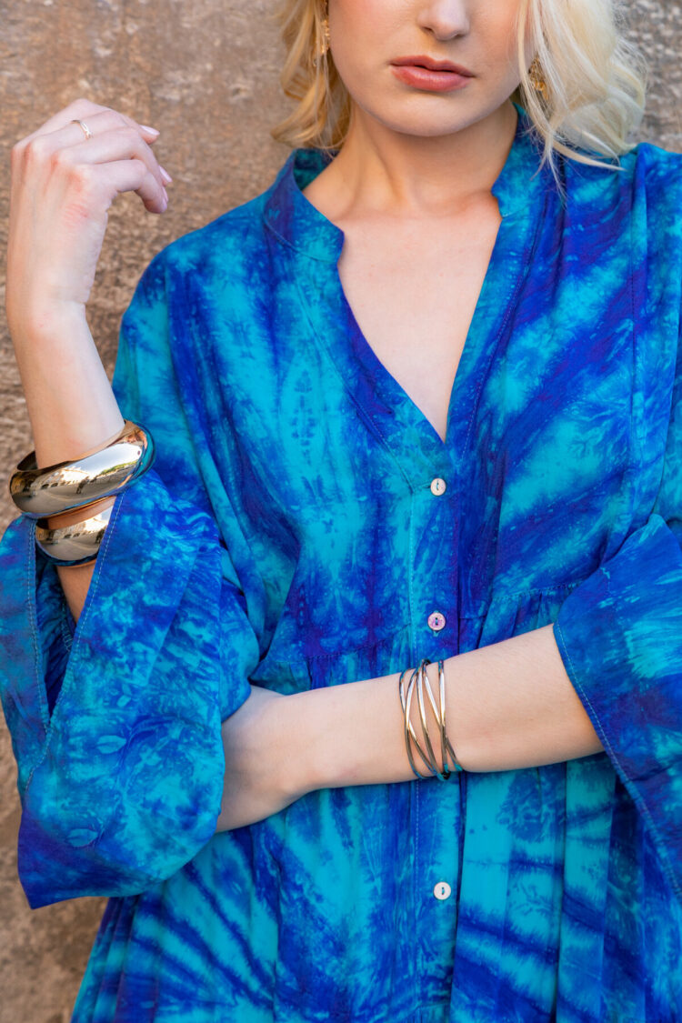 Avec son sublime dégradé tie and dye dans les tons de bleu, cette robe mi-longue évoque les vacances, l’azur et la douceur des journées ensoleillées. Sa coupe fluide et légèrement évasée met en valeur toutes les silhouettes, tandis que son tissu léger accompagne chacun de vos mouvements.