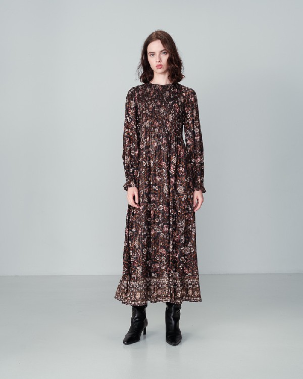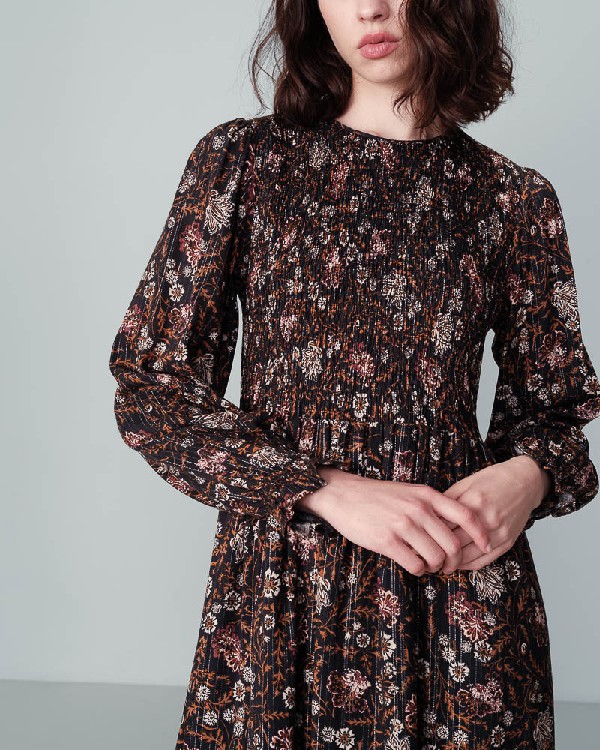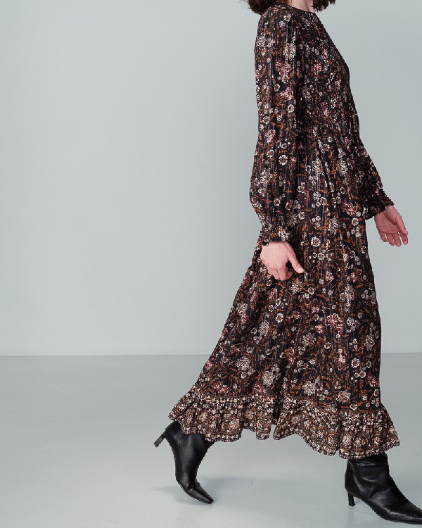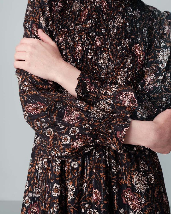 La robe imprimée NOVA est une pièce incontournable de notre collection. L'imprimé fleuri exclusif Grace & Mila ainsi que les manches bouffantes à poignets smockés signent l'inspiration bohème romantique. Les volants aux manches et au bas de la robe longue NOVA créent du volume tandis que, les détails en lurex, lui ajoutent du contraste. Ce modèle rejoint notre gamme en fibres naturelles 'Un Brin de Vert'.