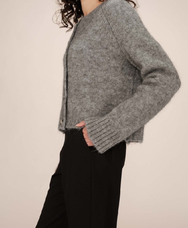 Tricoté dans un fil mélangé de laine et d'alpaga, le cardigan boutonné SALMA est une pièce douce et confortable. La coupe droite et les manches raglan lui donnent une allure décontractée, tandis que les finitions en côtes structurent la silhouette. L'encolure ronde et l'ouverture boutonnée du cardigan en laine SALMA en font une pièce qui s'invite dans le vestiaire du quotidien.