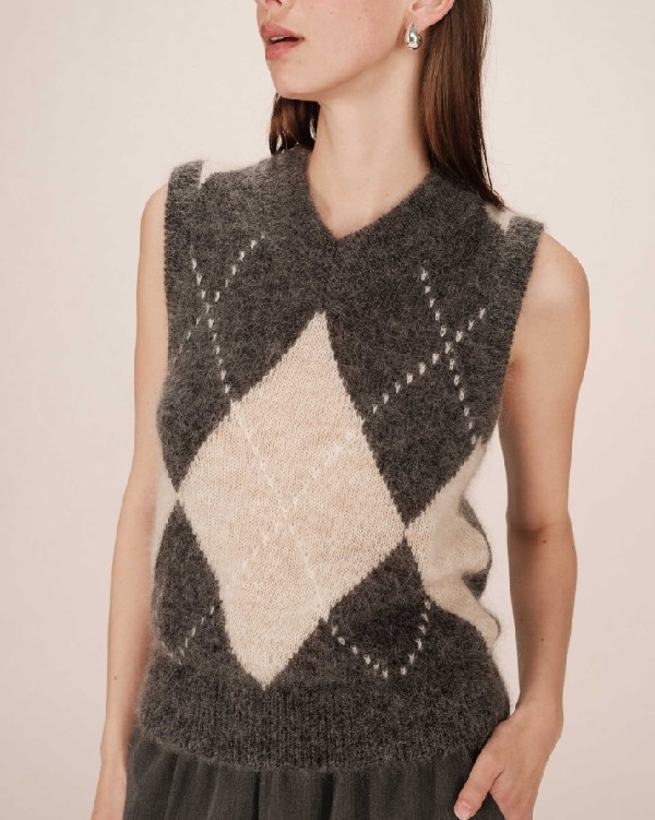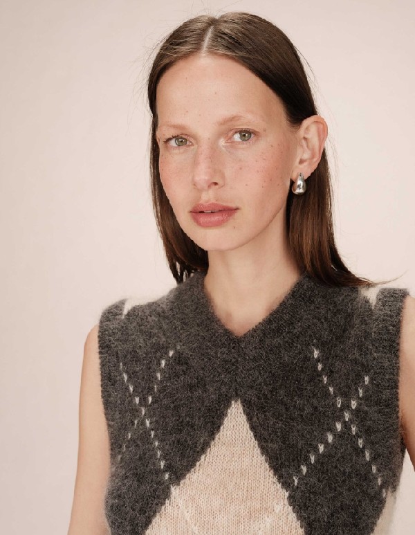 Le pull en laine SALVO revisite le motif argyle dans une version sans manches et crée une silhouette classique et affirmée. Le col V large du pull losange SALVO ajoute une touche de modernité tandis que la coupe et les finitions soulignent l'esprit classique du modèle. Tricoté en laine certifiée RWS et en mohair, c'est une pièce chaude et un incontournable du vestiaire de la saison