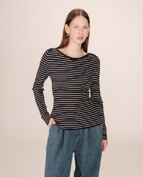 Le pull à manches longues SAMEDI séduit par son élégance discrète et son esprit marin. Tricoté dans une maille fine à côtes, il épouse la silhouette grâce à sa coupe ajustée. Les rayures intemporelles et l'encolure bateau lui confèrent une allure chic et décontractée. Le pull à rayures SAMEDI s'invite dans le vestiaire du quotidien.