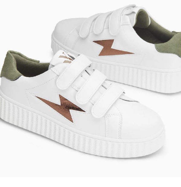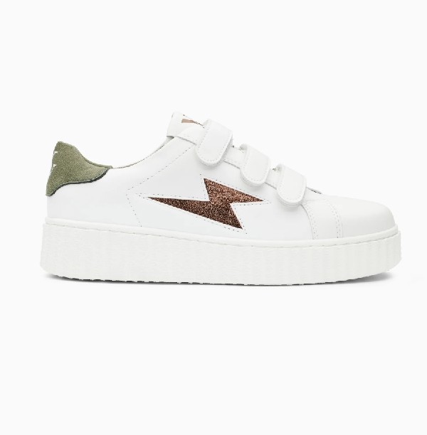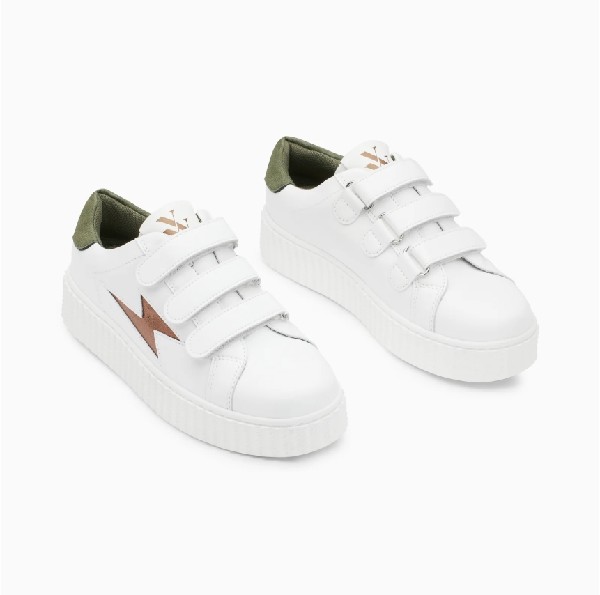 REF : BK2618CH- Baskets en similicuir blanc- Découpe en forme d'éclair en similicuir texturé bronze- Patch arrière en suédine effet peau de pêche vert kaki foncé- Fermeture à scratchs blancs- Bout rond- Semelle creepers blanche