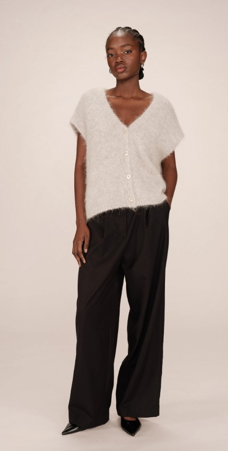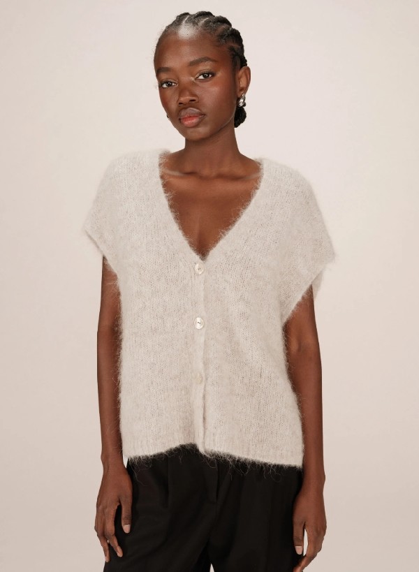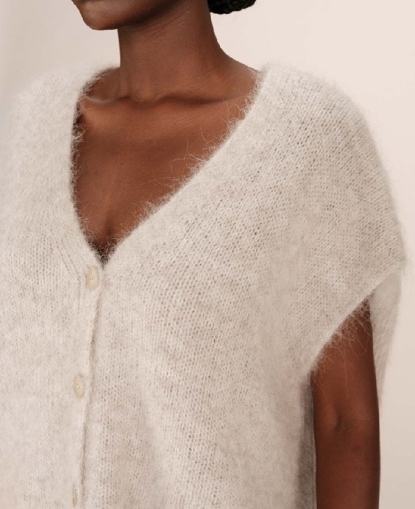 Le cardigan sans manches SAVANT est une pièce tricotée dans un fil mélangé d'alpaga et de laine. La coupe large et l'encolure en V conviennent à chaque morphologie et subliment les courbes féminines. L'ouverture boutonnée sur le devant apporte une touche de classicisme à cette pièce moderne et polyvalente.