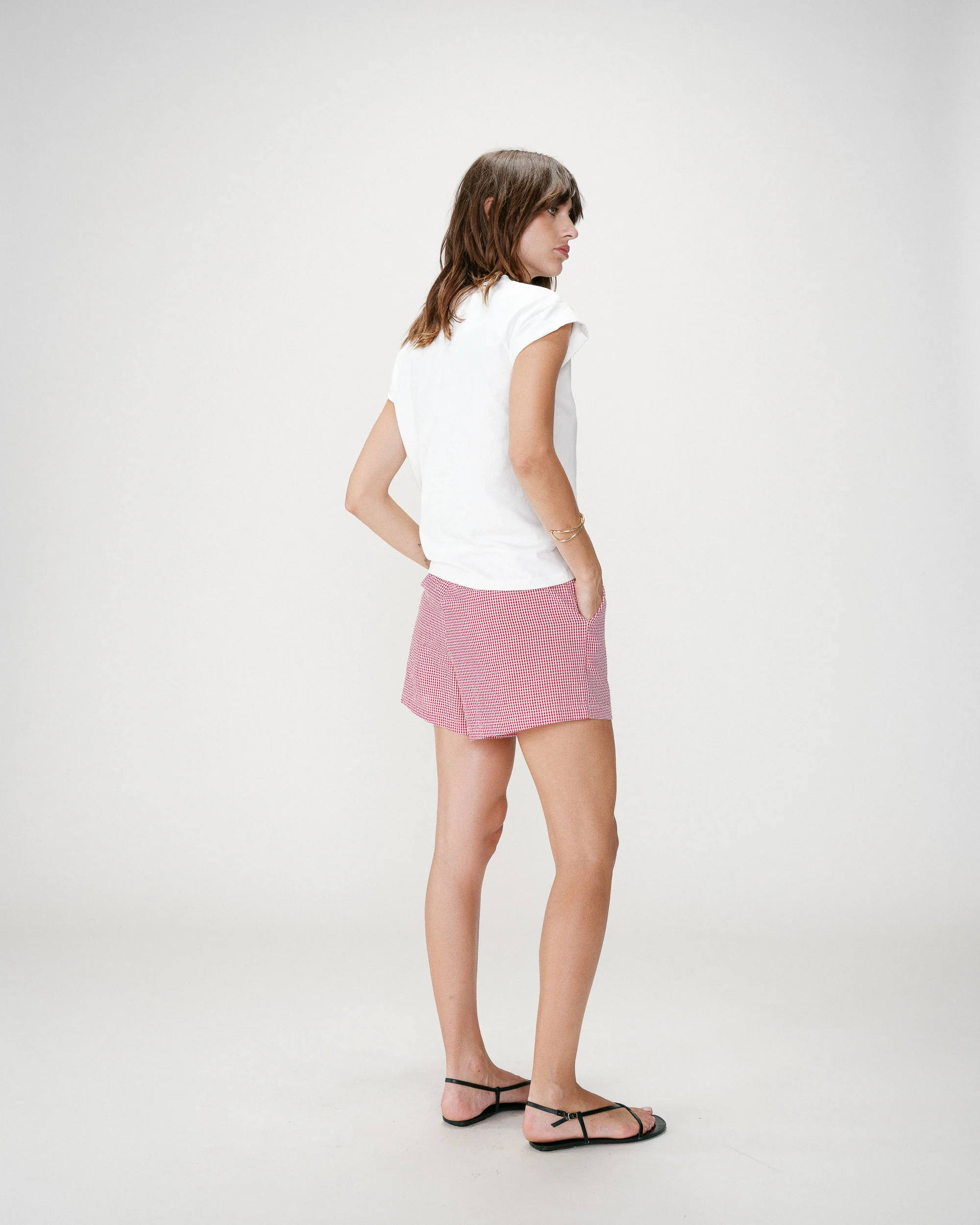 Le short Waylen en coton séduit par son motif vichy rouge intemporel et sa coupe ample qui apporte confort et légèreté. Confectionné en seersucker, il offre un tissu légèrement texturé, idéal pour les journées ensoleillées.