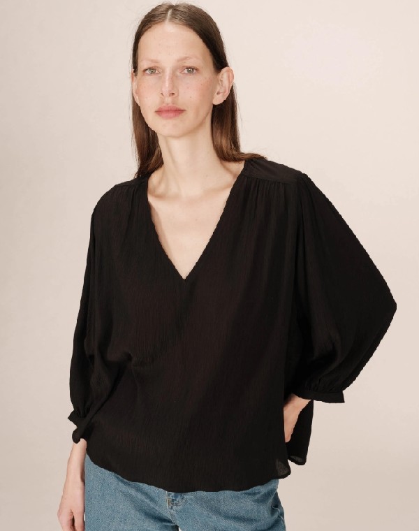 La blouse fluide SOLO dessine une silhouette classique et élégante. Les manches 3/4, l'encolure en V et les détails de fronces aux poignets, aux épaules et au dos font de la blouse SOLO une pièce à la féminité affirmée. Confectionnée dans un tissu léger et aérien, la blouse décontractée SOLO est un modèle agréable et facile à porter.