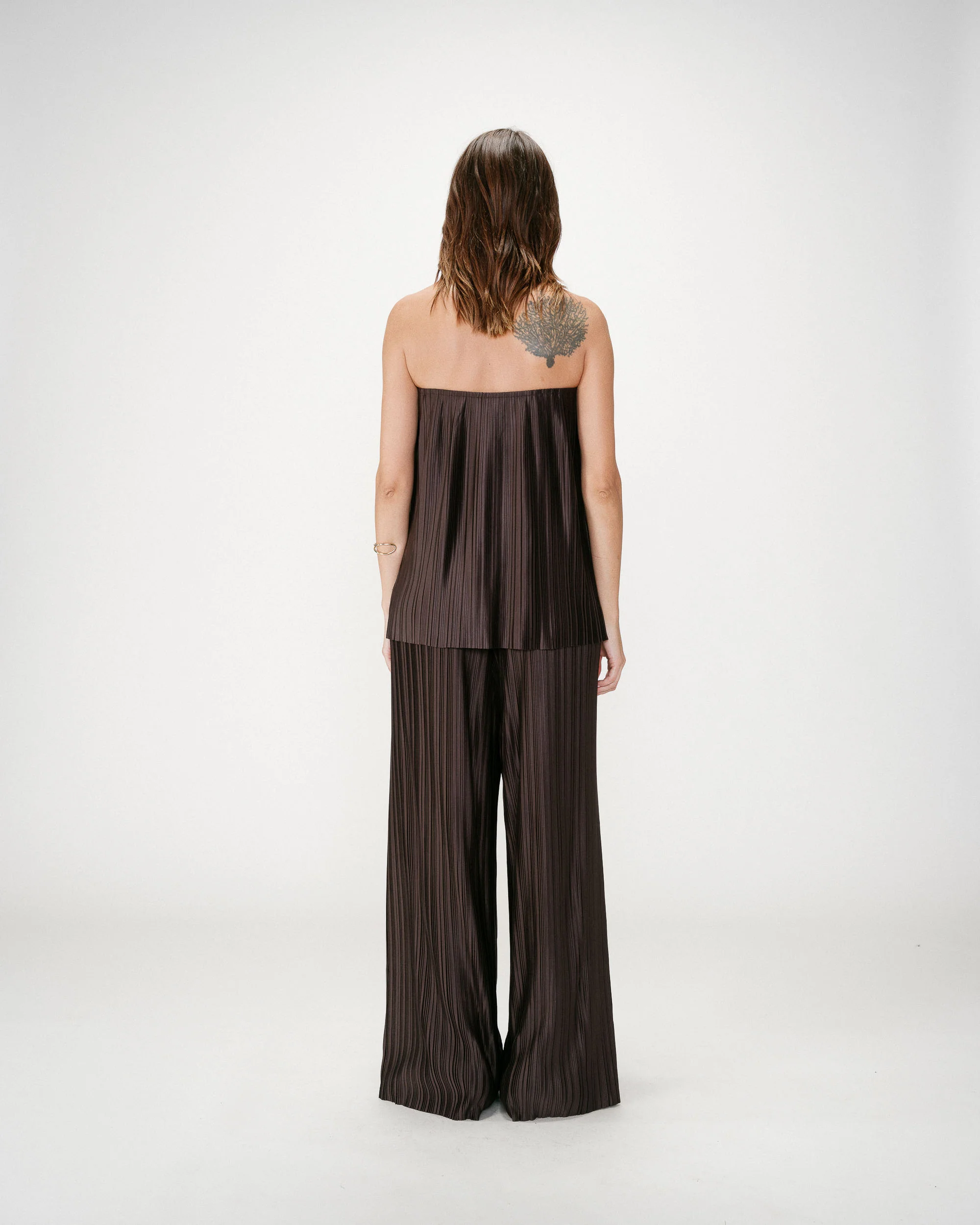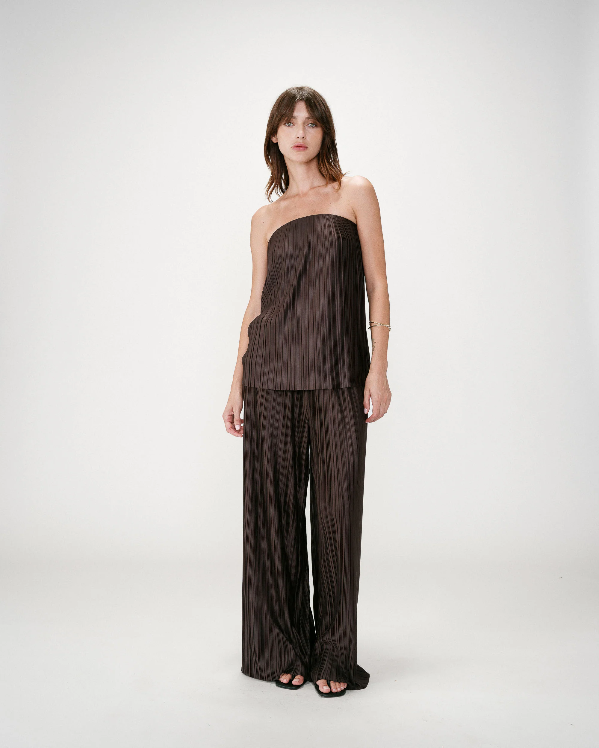 Le top bustier West séduit par sa coupe fluide et son tissu plissé qui apporte légèreté et mouvement. Sa ligne de buste entièrement élastiquée assure un maintien confortable tout en mettant en valeur la silhouette.