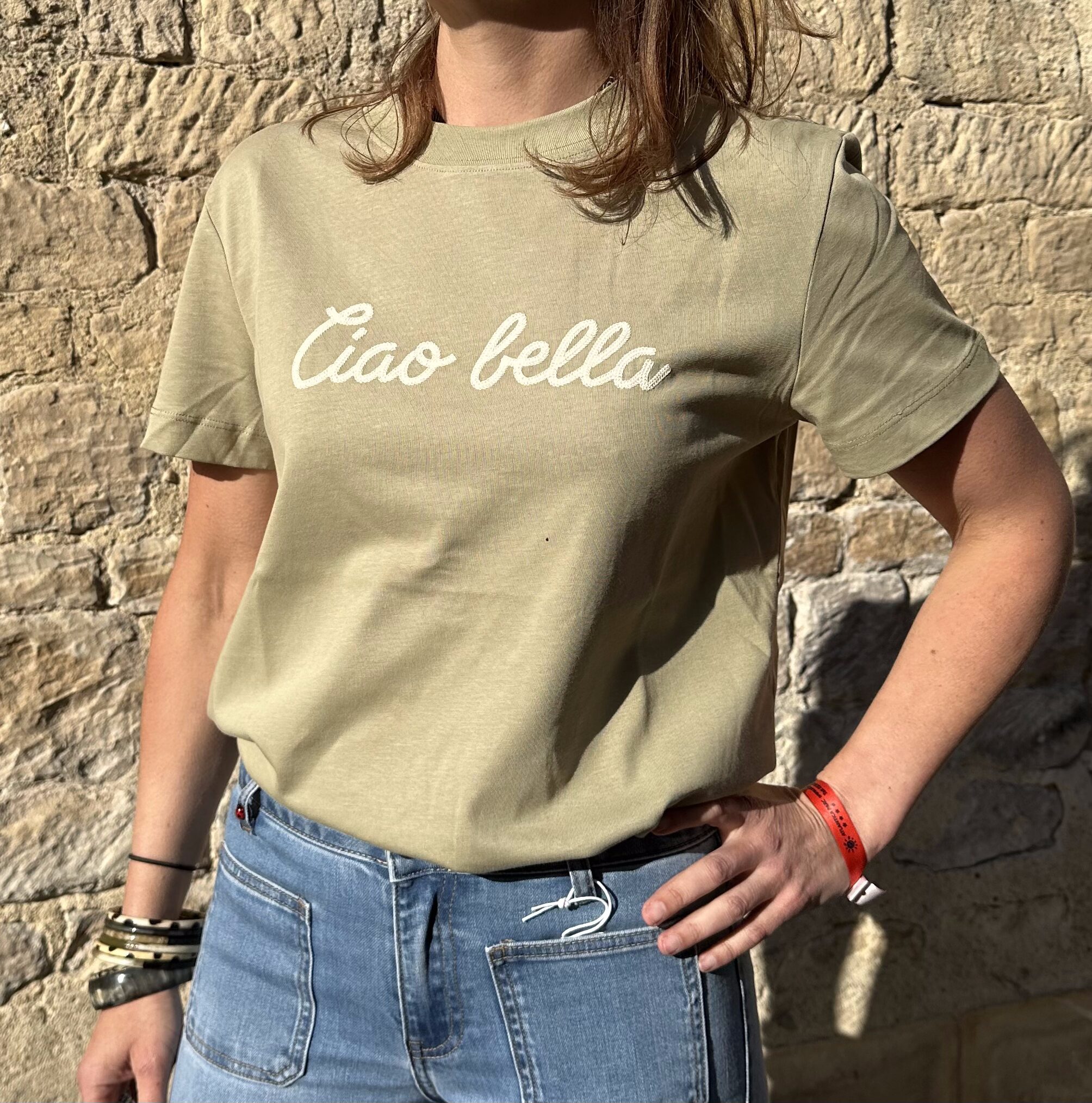 Sa coupe droite et son col rond en font un basique facile à associer, tandis que le message brodé “Ciao Bella” sur le devant apporte une touche féminine et lumineuse. Simple, mais avec ce petit détail qui fait sourire.